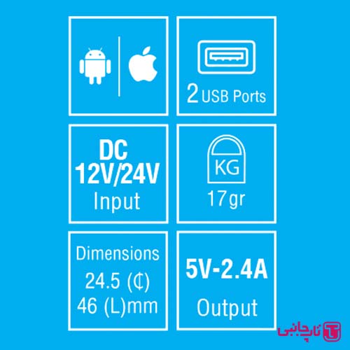 - 🔌 دو درگاه خروجی USB 2.0 برای شارژ همزمان دو دستگاه